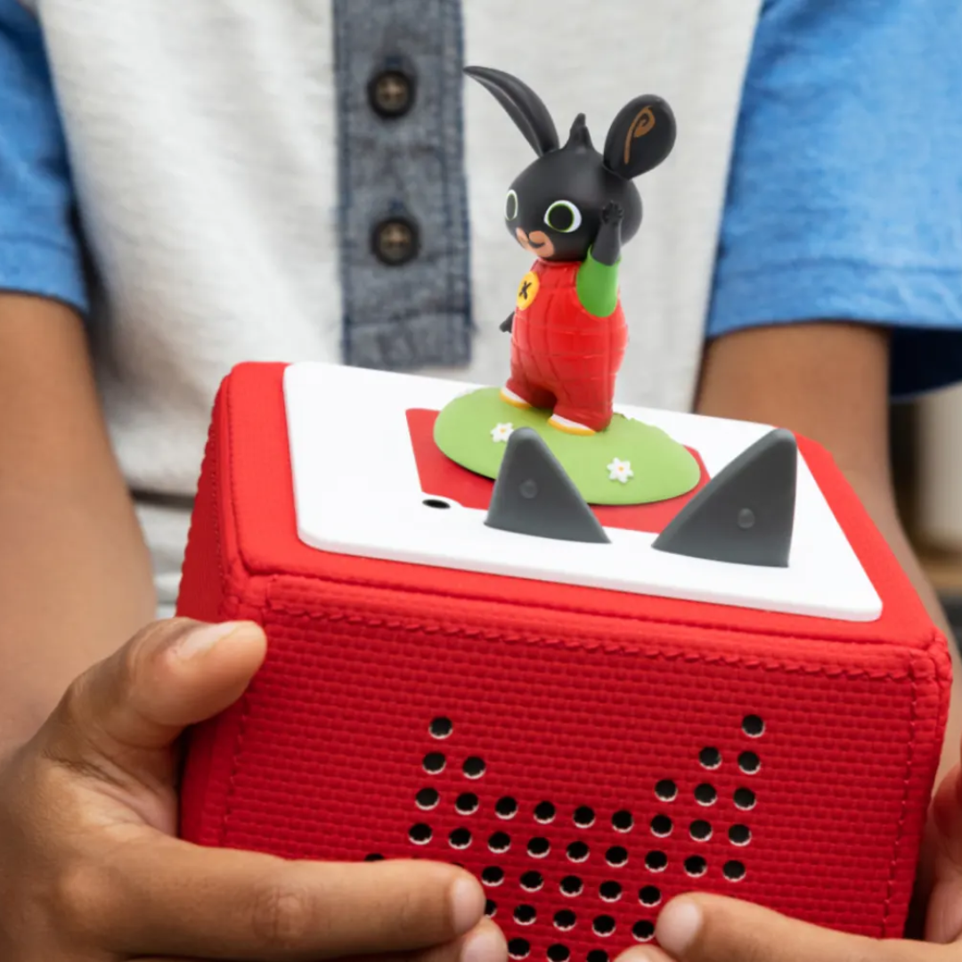 Simply place a Tonie on top of the Toniebox to start listening. Tap the sides to skip tracks, rewind, or fast-forward through stories, and adjust the volume by gently squeezing the ears.