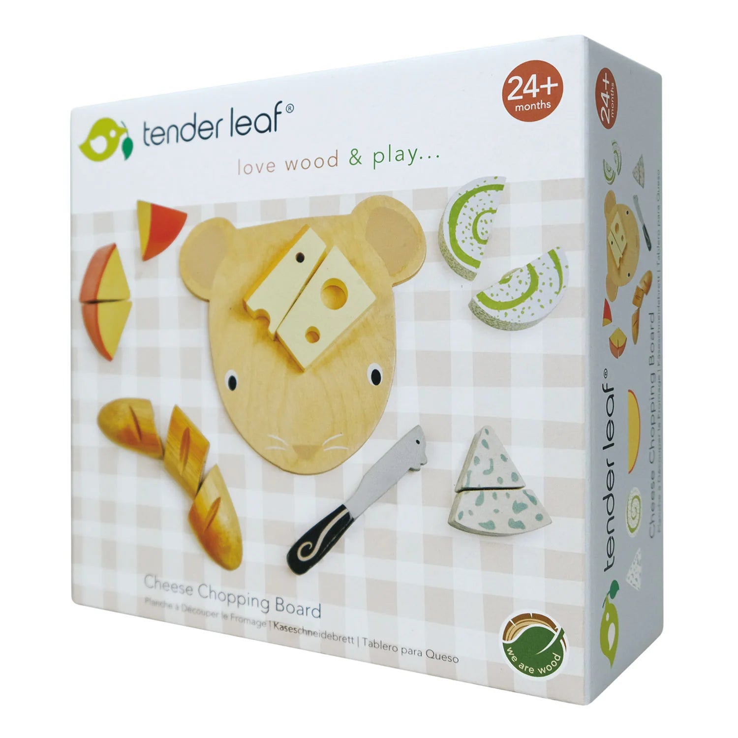 A pretend play mouse-shaped wooden cheeseboard with lots of character! A great little pretend food chopping set, ready to add to any of our kitchen set ups. Comes complete with a mousey cheese knife, a baguette in 3 parts, an Edam cheese in 3 parts, a Gruyere, a Rouleux, and a blue cheese in 2 parts. Attached with velcro for easy cutting.