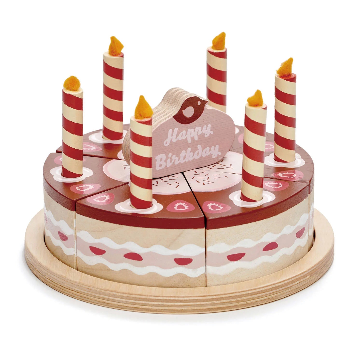 A solid wood chocolate birthday cake. Topped with 6 candles and a happy birthday plaque, this toy cake is held together on a natural wood plate.
