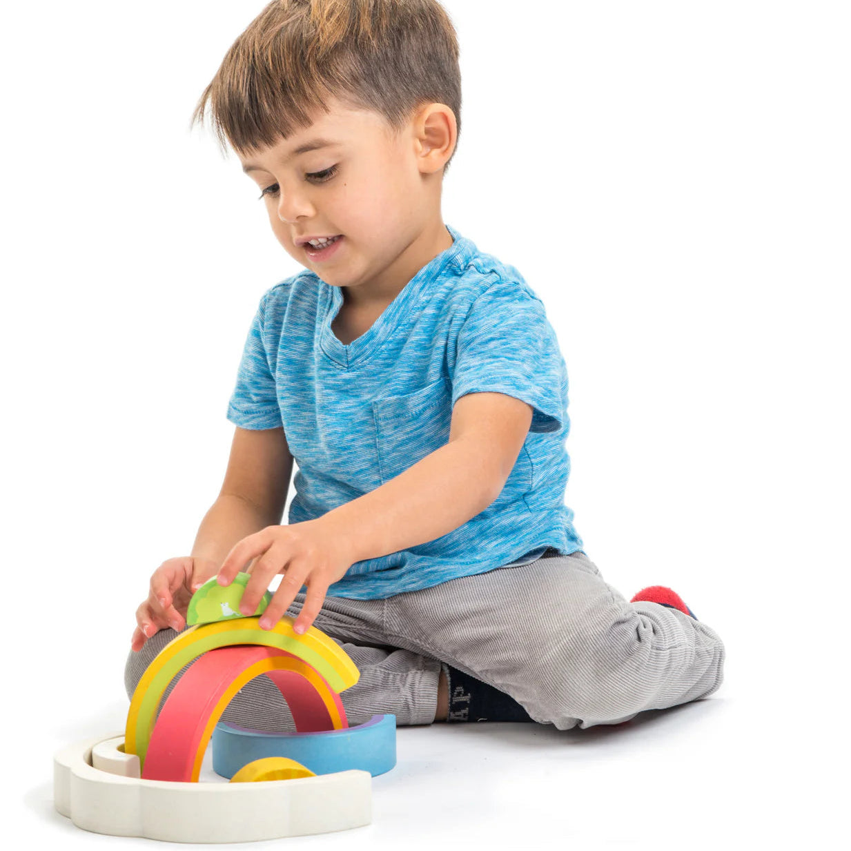 A 7 piece wooden tunnel puzzle toy, that stacks together like a real rainbow.