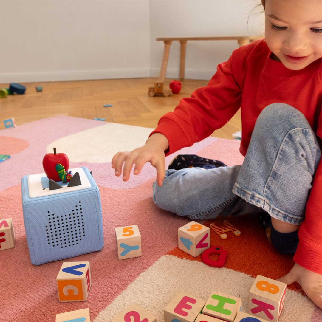 Simply place a Tonie on top of the Toniebox to start listening. Tap the sides to skip tracks, rewind, or fast-forward through stories, and adjust the volume by gently squeezing the ears.